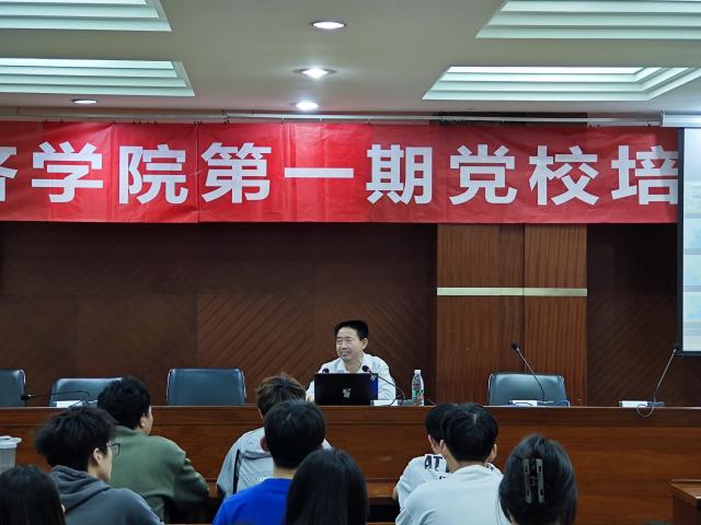 开班仪式后,江水法教授为全体学员讲授第一堂党课。江教授以诙谐、有趣的语言风格,结合自己骑行国内外的研学经历,鼓励同学们要树立远大的理想信念。他指出大学生要有梦想,不但要读万卷书,更要行万里路,制定计划,逐步实现梦想。随后,江教授解读了党的二十大报告对青年的要求,诠释了党选取人才的标准。他指出,优秀党员必须把政治标准放在第一位,做到抗压能力强,对党交付的工作高度负责。他强调,优秀青年干部要把“当老实人、讲老实话、做老实事”作为人生信条;入党动机要纯粹,切忌急功近利、投机取巧。最后,江教授为全体学员讲解了一名党员必须把握好的若干重大政治问题。