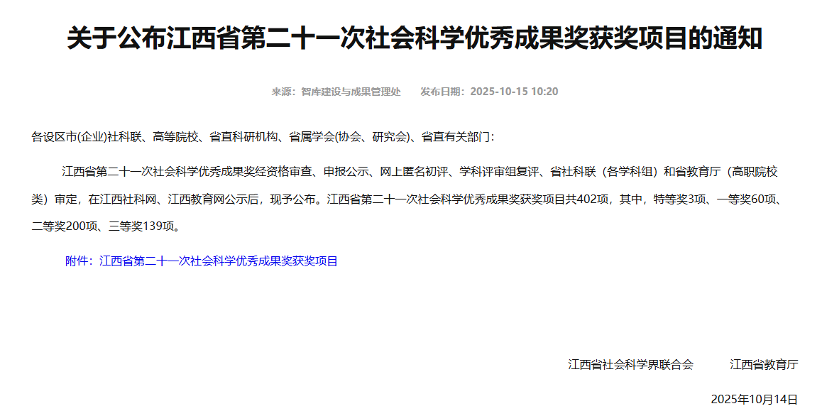 【扩展阅读】江西省社会科学优秀成果奖是江西省社科界最高级别的学术奖项,每两年评审一次,代表了该时间段内最具有社会影响力的社会科学研究成果。